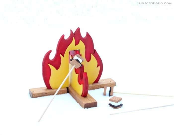 The imagination of your child will run wild when they set up camp and start telling stories while roasting smores. Jaime explains with detailed instructions how to attach the flames to the 2×3 studs once you have them cut out. She explains that there isn’t a wrong way to make your flames. Add a little paint and some wooden smores, and you have an instant campfire.