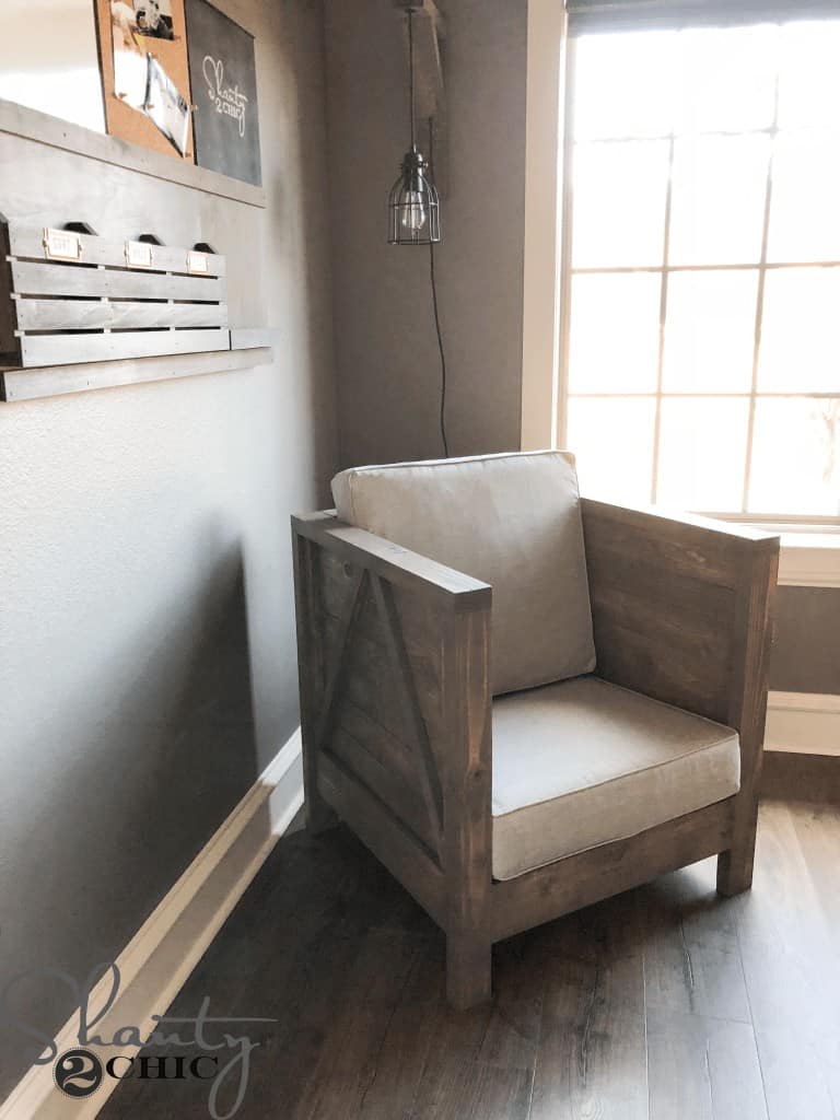 A hand-crafted piece of furniture in any room makes an impressive statement. The farmhouse club chair Ashley and Whitney created in Shanty-2-Chic is no exception. Their chair is large and sturdy with a simple design that is both rustic and clean-looking.