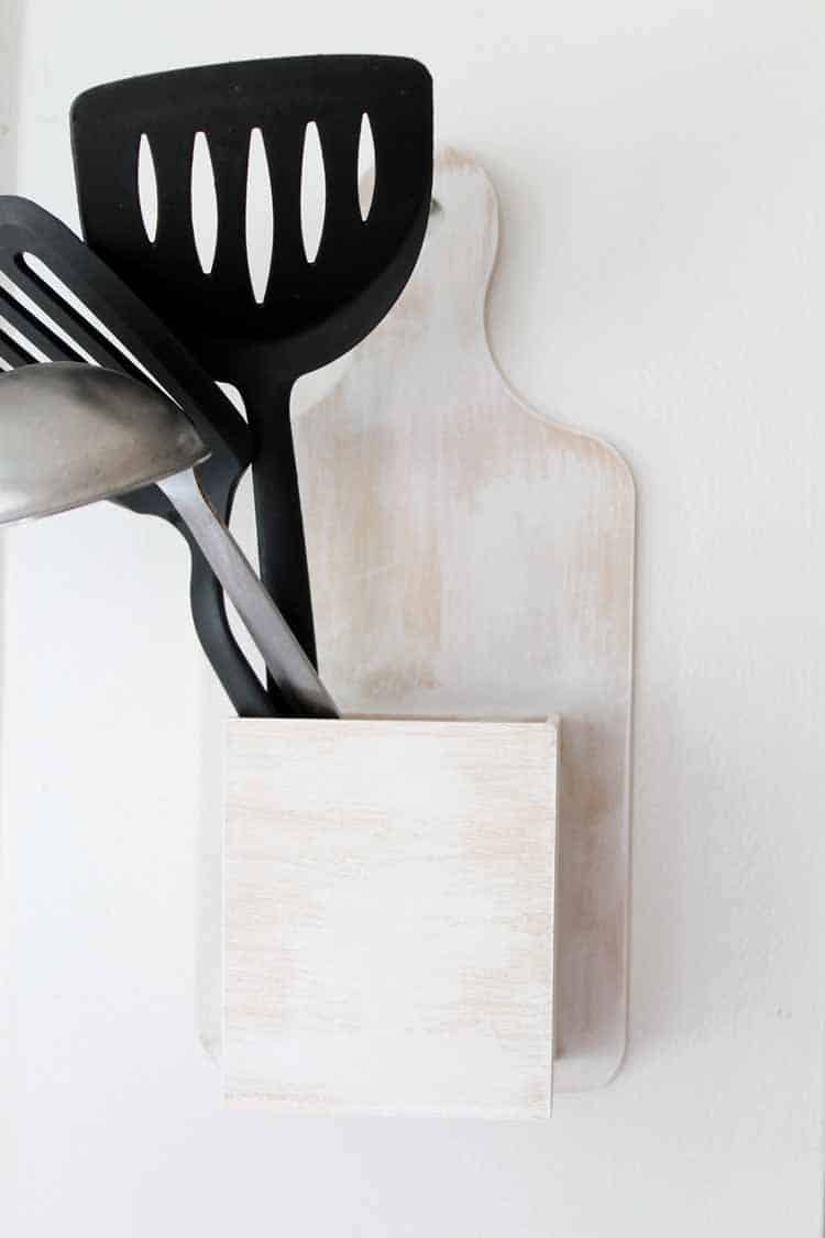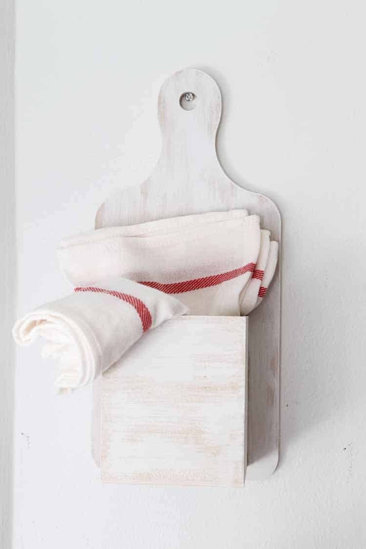 Angie gives us a complete list of supplies, most of which are readily available at your local craft store. The main components of this project are an unfinished wood breadboard and an unfinished wood box. A rustic look is achieved by using a dry brush technique and white paint. The dry brush allows streaks of the original wood to show through making the unit look worn.