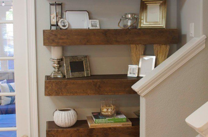 She finished her project in only 2 days but pointed out that it could easily have been completed in only one day if there were no interruptions. Samantha provides a complete list of recommended supplies for constructing the shelves with information about where to purchase some of the tools needed. The supply list provides enough materials to build 8 shelves. These shelves are easily adapted to fit in any room and any decor. Samantha stained her shelving, but another option would be to paint them in either the same color as your wall or in a contrasting color so they will stand out.