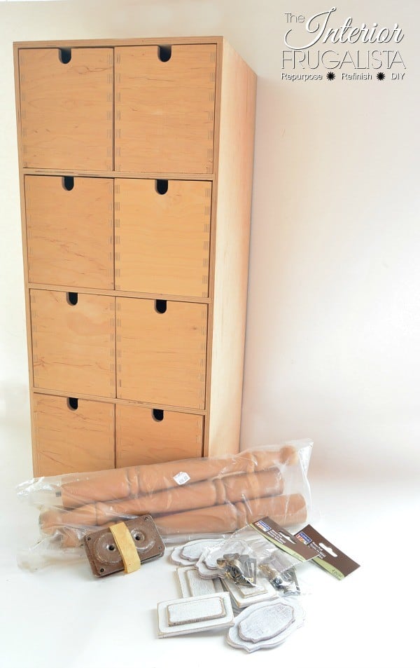 Marie starts by giving us a complete list of supplies for this project. She began by adding a plywood top and base as well as legs to give the piece some substance and help to make it look more like a piece of furniture rather than a plain no-frills cabinet. She then painted the entire cabinet with a soft white chalk paint and used her sander to give it a softly distressed look. Next, small label pulls were affixed to little plaques and added to the drawers.